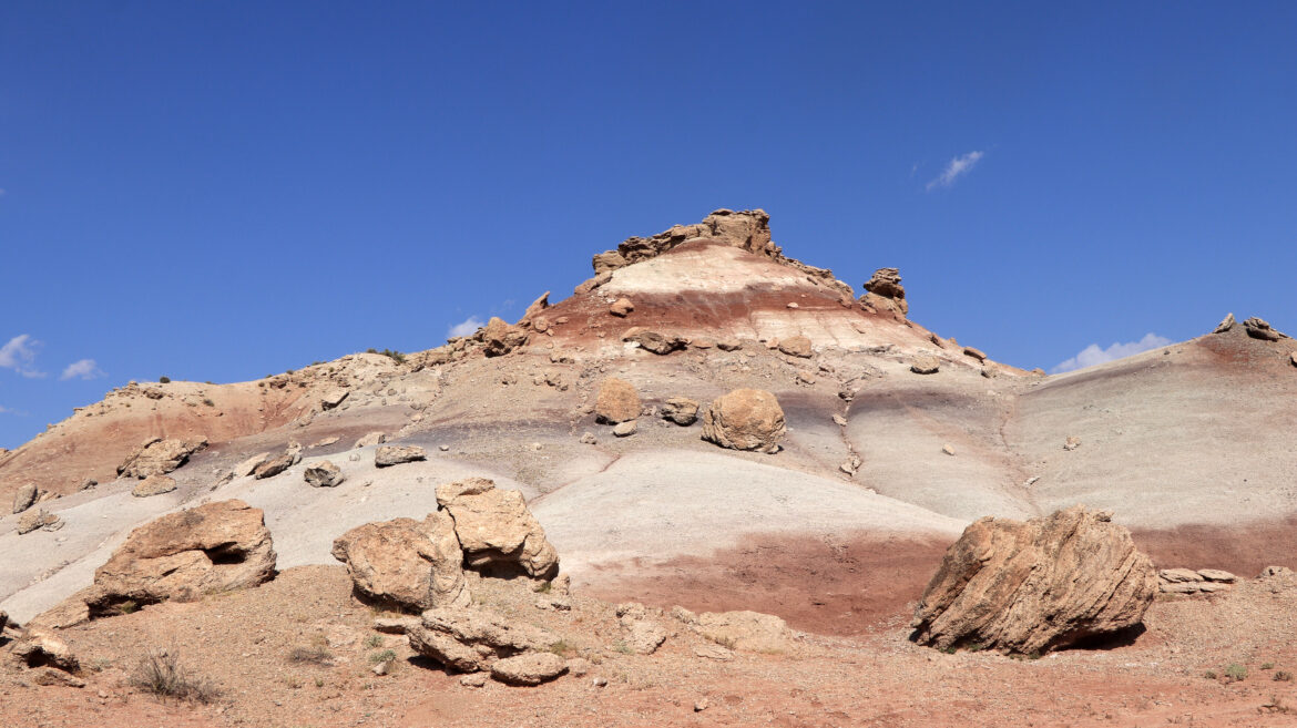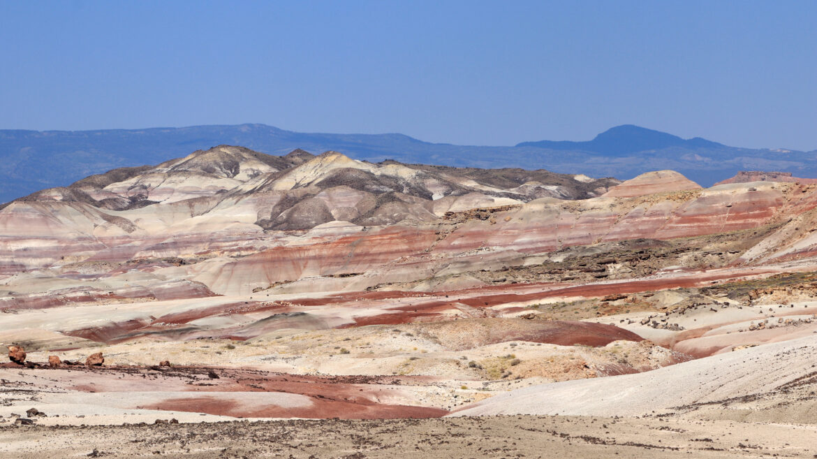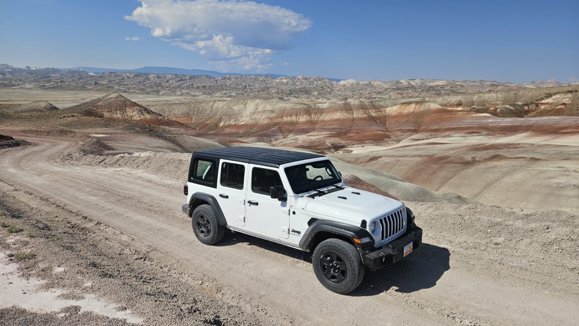 Door de Fremont rivier is een eitje en daarna bekijken we bijna alle mustsees van Cathedral valley. We passeren een verroeste truck vol met kogelgaten, die hier jaren geleden is achtergelaten, leuk om te fotograferen. Kort daarna bereiken we de Bentonite Hills, mooie rood en grijs gekleurde kleiheuvels. Een mooie plek om ons meegebrachte ontbijt te eten. We gaan weer verder en slaan een zijweg in van 1.2 mijl om naar de Lower South Desert overlook te gaan. Onderweg rijd je Capitol Reef N.P. weer binnen. Vanaf de parkeerplaats is het 400 meter wandelen naar het uitzichtpunt waar we genieten van o.a. Jailhouse Rock, een ruim 150 meter hoge monoliet. Terug op de parkeerplaats eten we de pizza van gisteravond, en die smaakt erg goed. Om tijd te winnen, ik denk ongeveer een uur, slaan we de Lower Cathedral Valley overlook over.