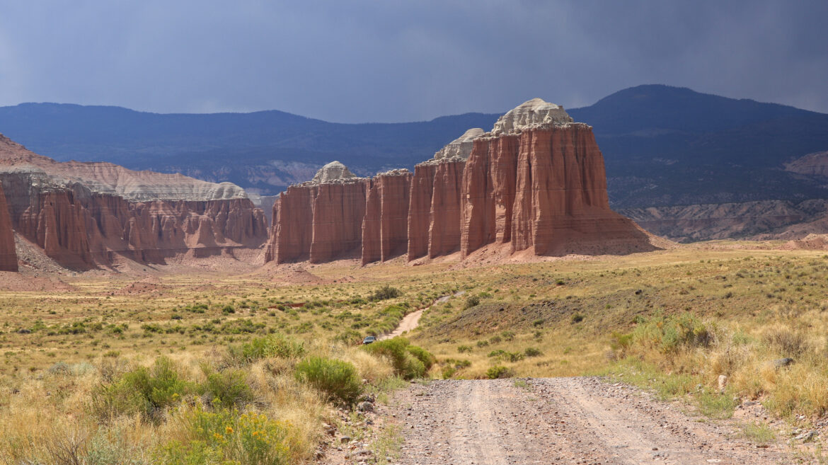 De Upper Cathedral Valley Overlook is volgens onze routebeschrijving geen must en even later zien we waarom. Een paar honderd meter verder heb je een heel mooi uitzicht op de vallei. Via een aantal haarspeldbochten en een slecht gedeelte van de weg dalen we af in de vallei en rijden we even later langs de mooie rotsformaties die we net zagen. Inmiddels zijn er wel dreigende donkere wolken, we hopen maar dat het droog blijft.