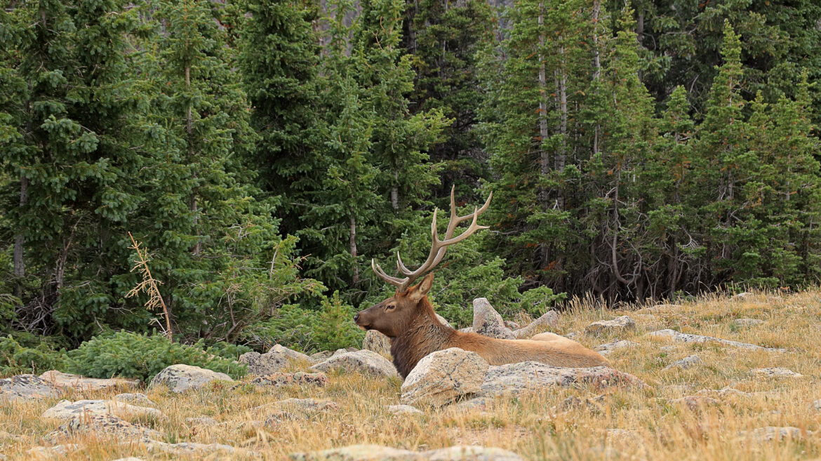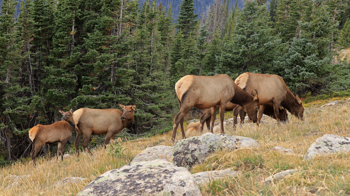 We hadden eigenlijk verwacht om hier marmotten te zien maar helaas. Een eind verder is een opstopping omdat een mannetjes Elk en een heleboel vrouwtjes vlak bij de weg rondlopen. Iedereen wil natuurlijk foto’s maken maar een ranger maant iedereen door te rijden. Een eindje verder parkeren we de auto en lopen terug om foto’s te nemen. Nou hebben we al heel veel Elks gefotografeerd, vooral in Yellowstone maar zo’n mannetjes Elk met een groot gewei blijft toch iedere keer bijzonder.