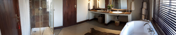 Na de heerlijke lunch gaan we naar onze chalets waar de koffers al heen zijn gebracht. Het is een prachtig chalet met een werkelijk enorme badkamer. De badkamer heeft een bad, een binnendouche en een buitendouche. Vanuit het bad kijk je op de drinkplaats. Volgens mij hebben we nog nooit zo’n grote badkamer gehad zelfs niet in Las Vegas. Er is ook nog een dek met twee hangmatten.