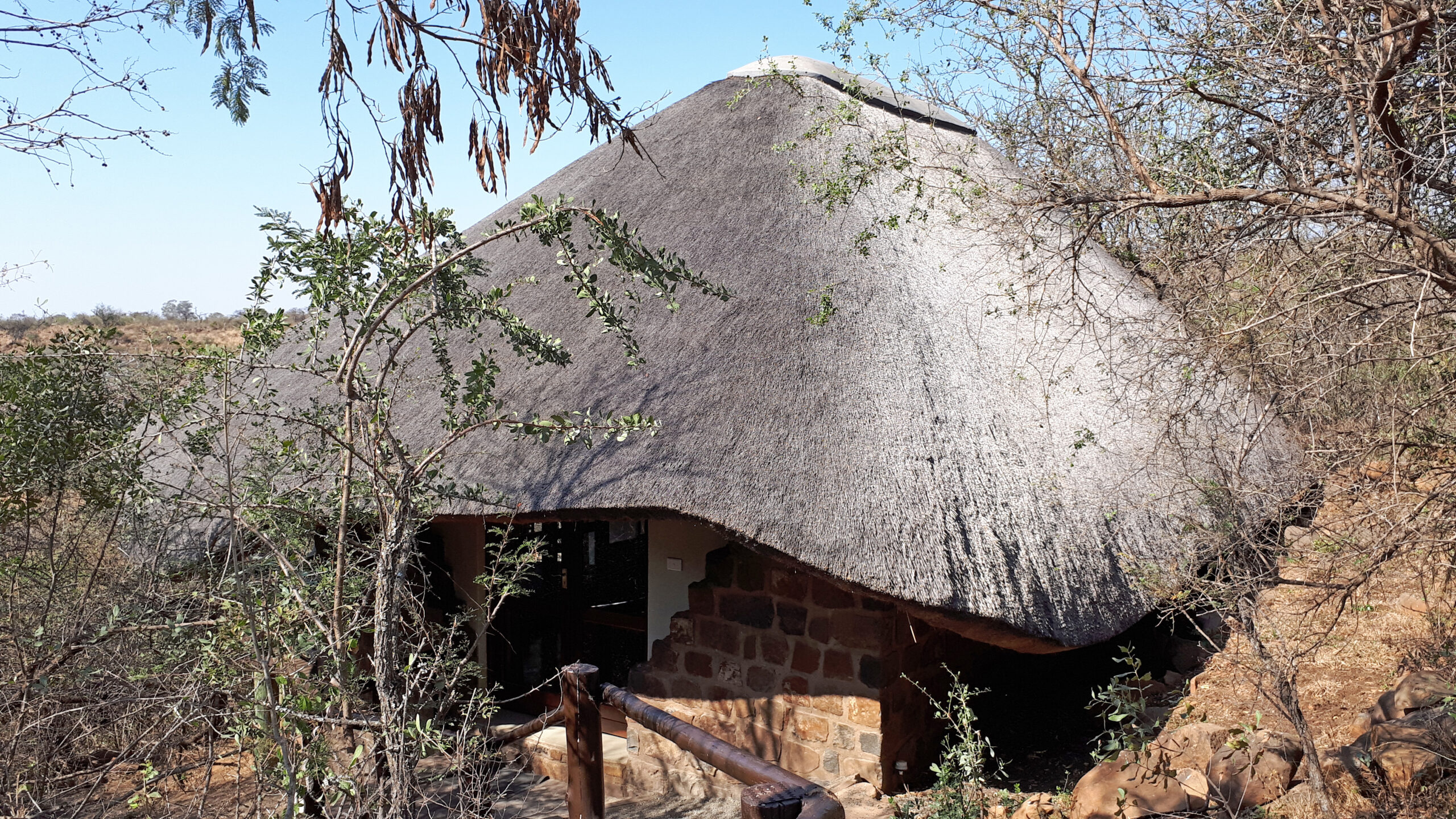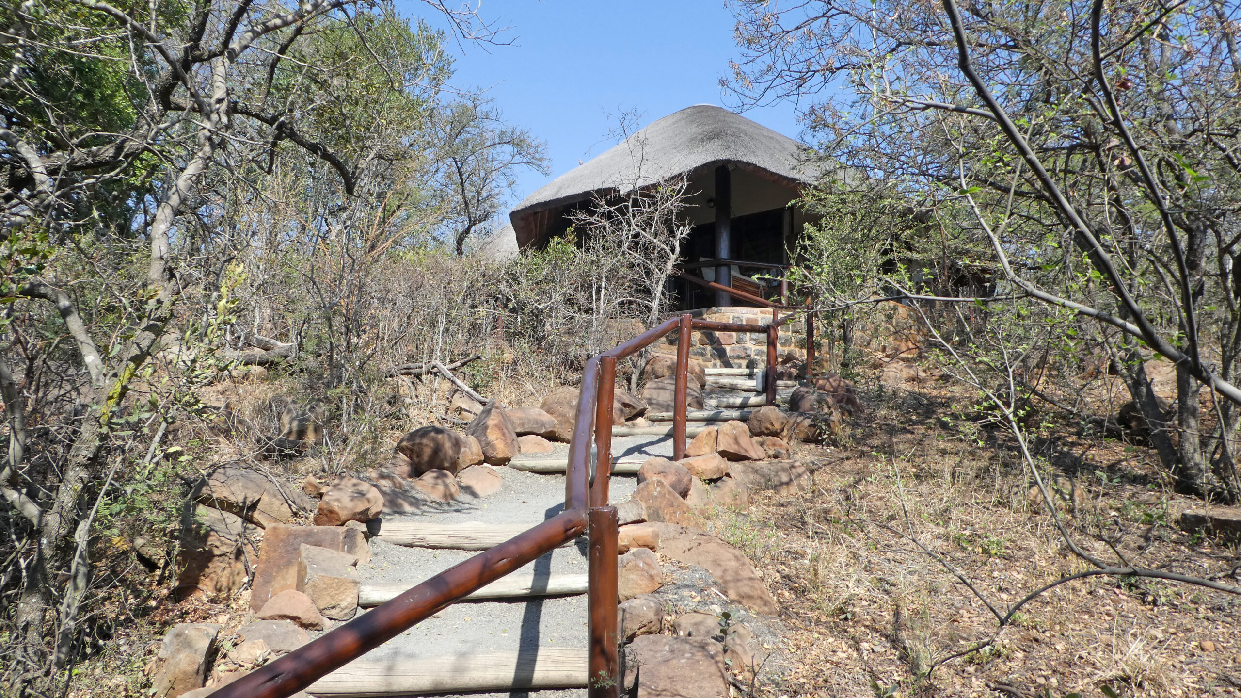 Na een korte stop in Ladysmith rijden we een eindje verderop een onverharde weg op. Deze weg moeten we 10 km. volgen tot we bij een parkeerplaats aankomen. Hier worden we verwelkomd door Steffany. We laden de bagage in de safari auto en tien minuten later zijn we bij de lodge die er fantastisch uitziet. Wij zitten hier in de Elephant Rock lodge met 4 chalets, dus heel kleinschalig.