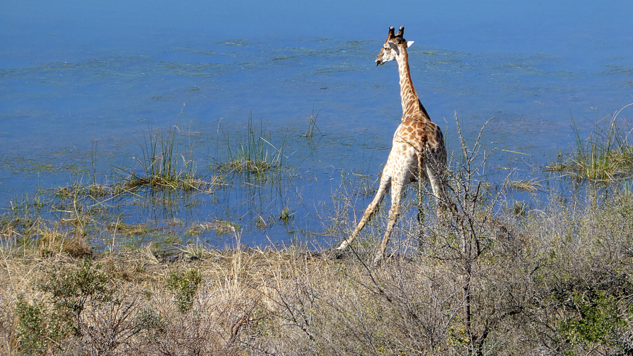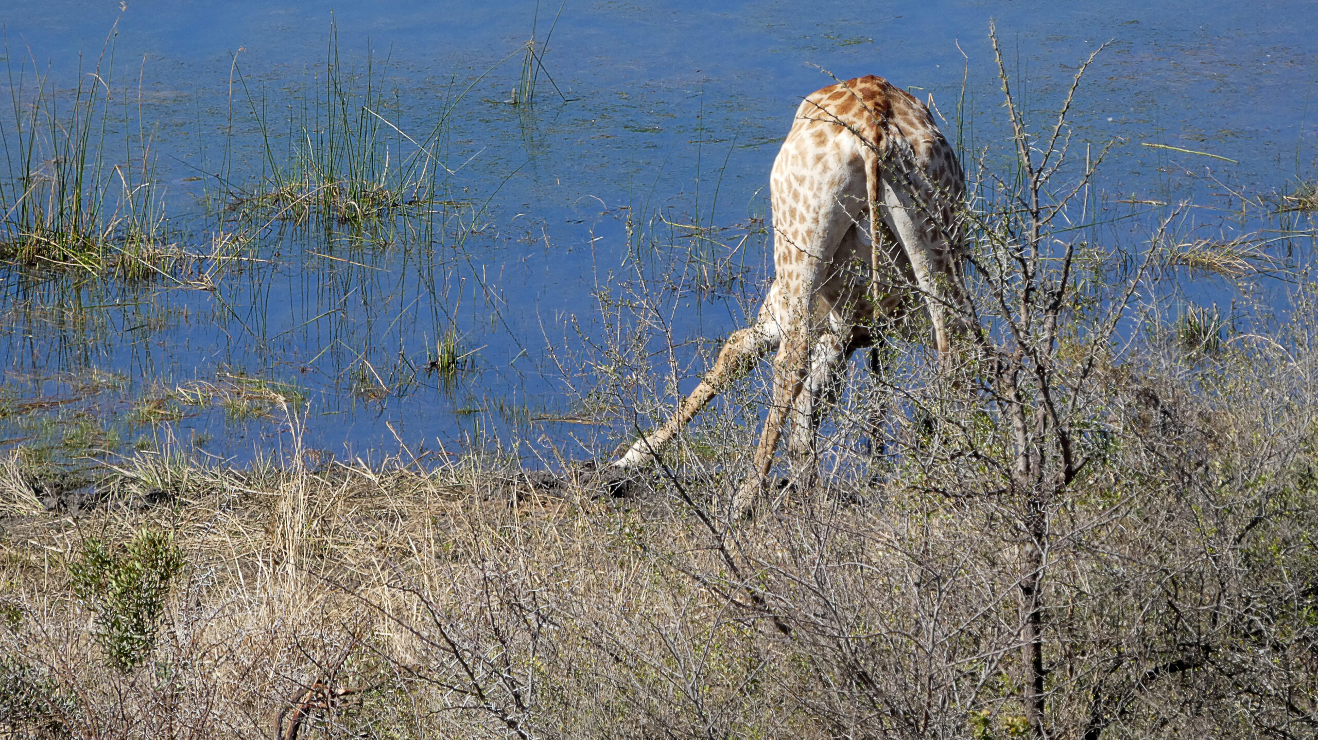 Als we aankomen, staat René klaar met 4 drankjes. Zij vertelt ons het één en ander over de lodge. Over een kwartier kunnen we lunchen. We nemen een heerlijke kop koffie en genieten op het dek van het mooie uitzicht op een drinkplaats voor dieren. We hebben geluk want er staan giraffen en zebra’s bij de drinkplaats. Balen dat ik geen foto’s kan maken.