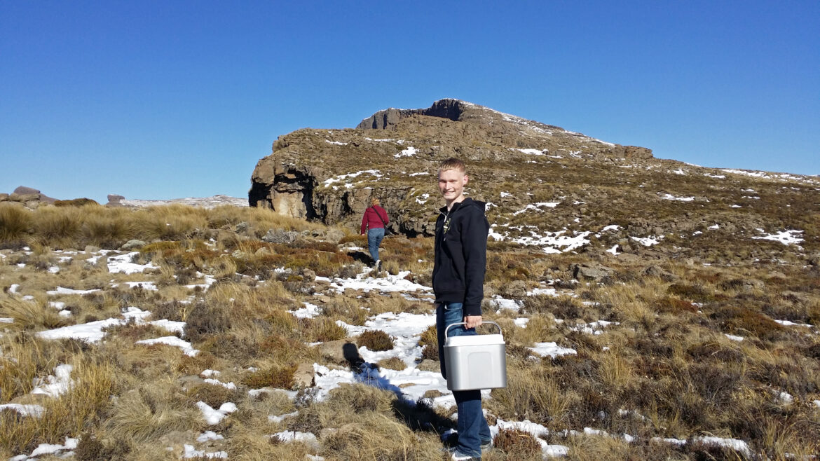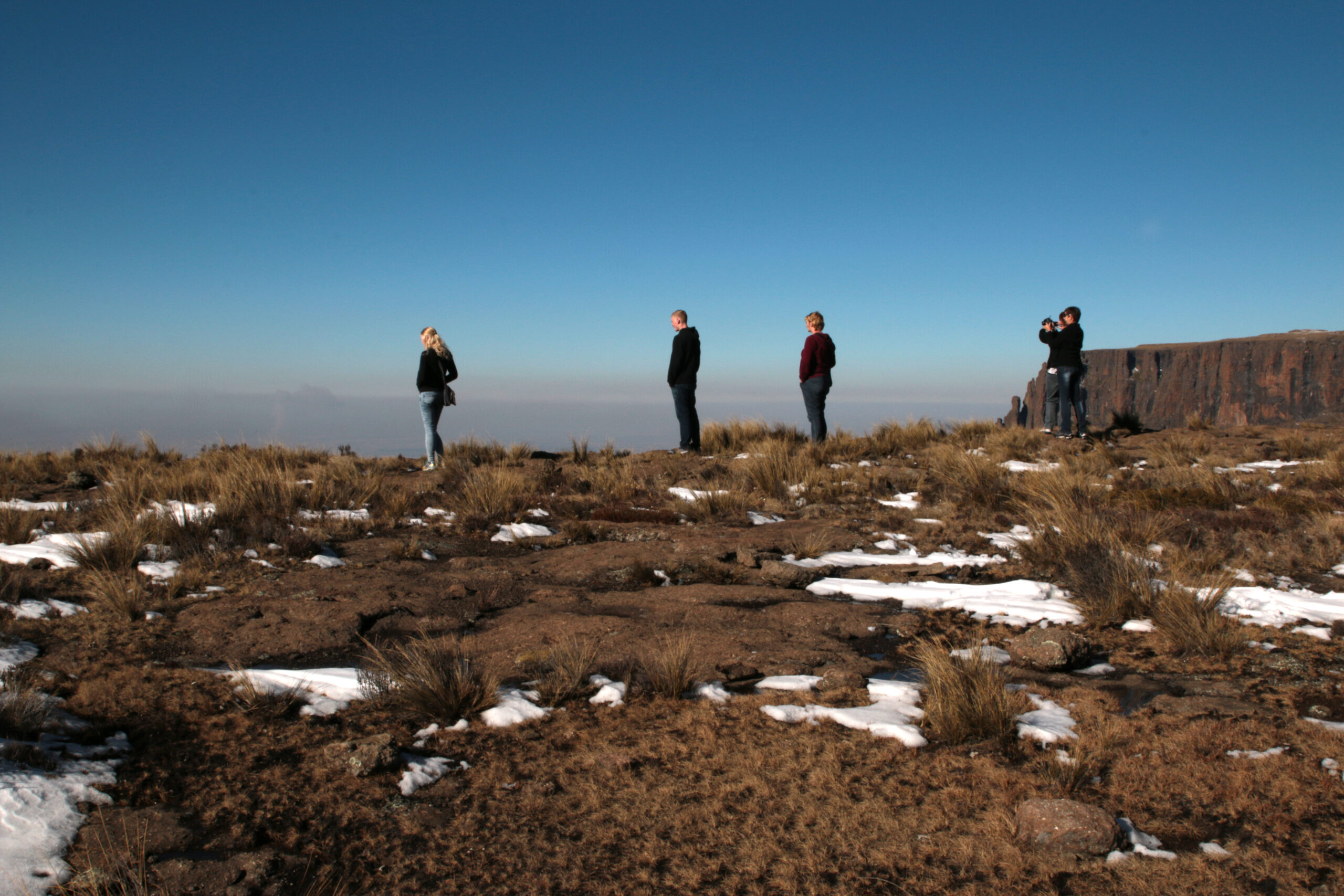 We worden allemaal gewogen en dan lopen we samen met twee andere mensen richting helikopter. Best wel spannend als je nog nooit in een helikopter hebt gevlogen. De helikopter wordt eerst volgetankt en dan kunnen we instappen. Jee, wat is het krap in zo’n ding. Allemaal een koptelefoon op en daar gaan we dan. En het is werkelijk prachtig. We zien meertjes, watervallen en besneeuwde bergen. Ik vind het wel jammer dat ik aan de zonkant zit en dus niet veel foto’s kan maken. De piloot vertelt wat we allemaal zien maar door het krakende geluid verstaan we er niet veel van, maar dat maakt niks uit. Het is gewoon mooi om de Drakensbergen vanuit de lucht te zien. We landen boven op een plateau waar sneeuw ligt. Echt schitterend hier. Wij nemen een glas champagne en toasten met elkaar en het smaakt nog lekker ook.