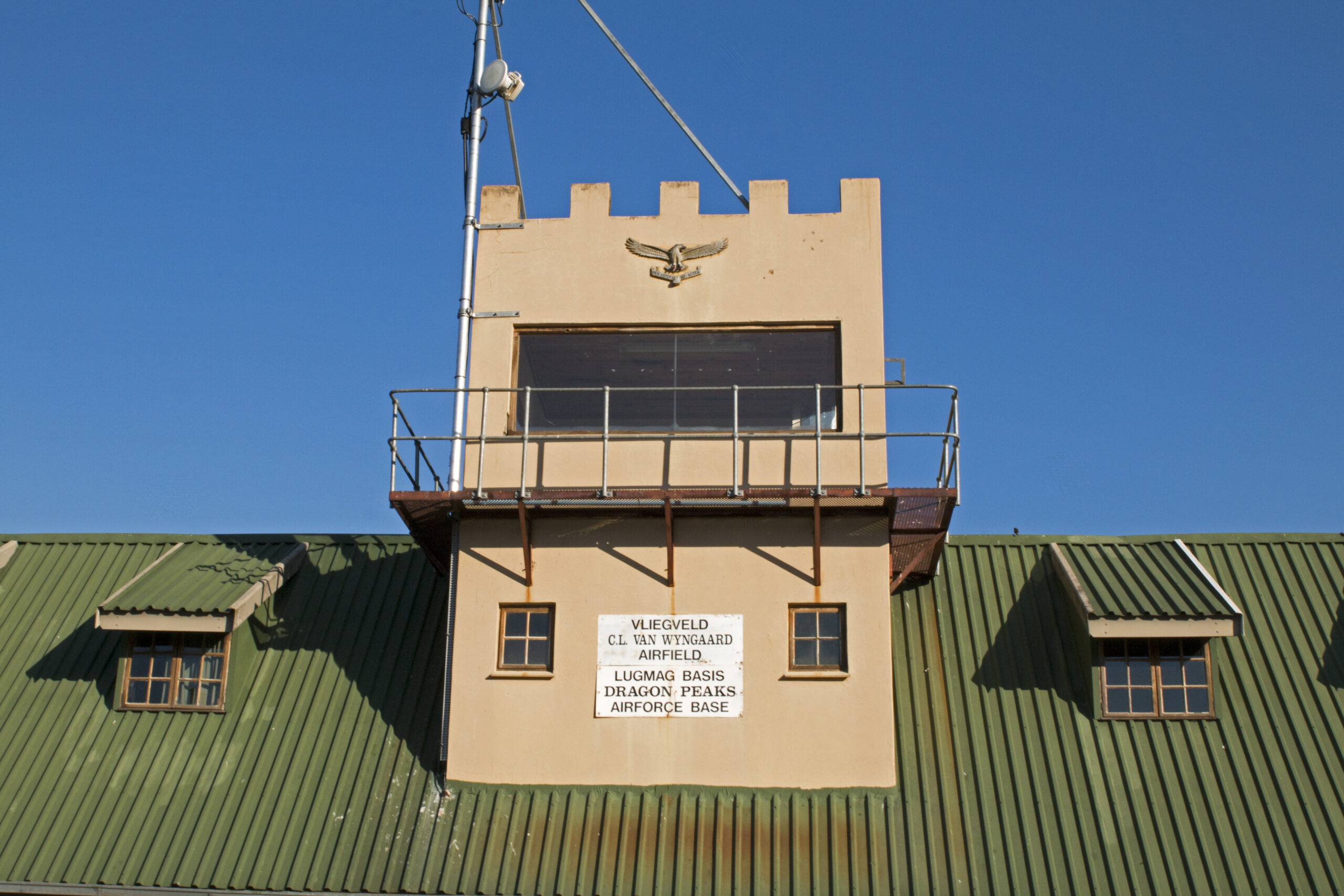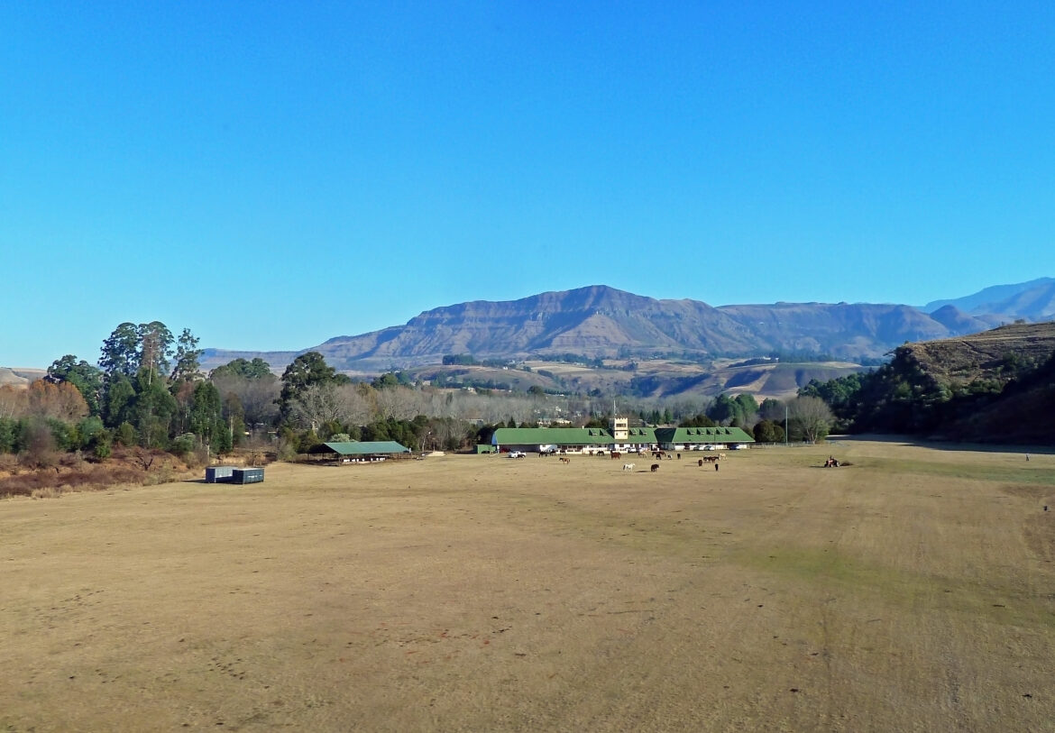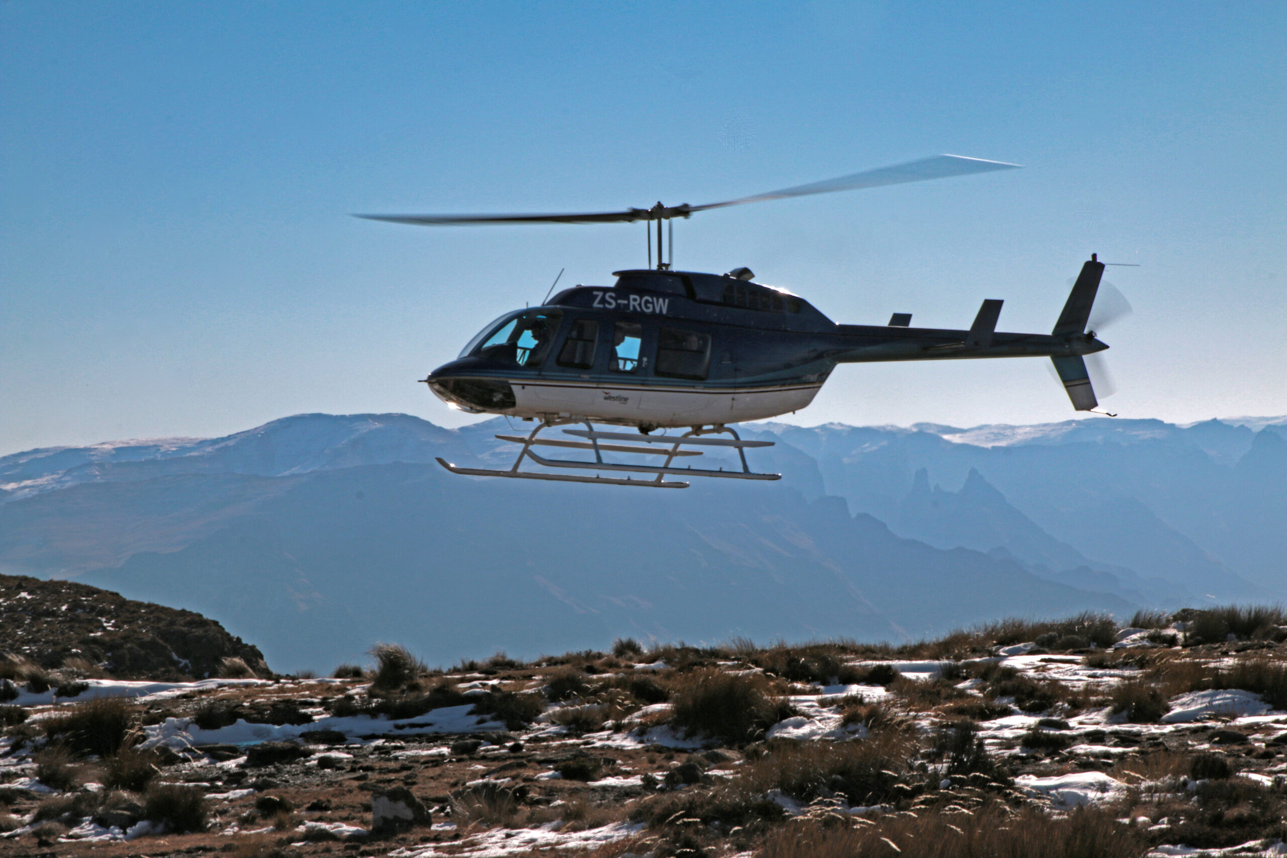 Bij het Cathedral Peak hotel dat hier vlakbij is hebben ze alleen kleine helikopters waar je maar met twee personen in kan. Als we met zijn vieren in een helikopter willen moeten we naar Dragons Peak, ongeveer 45 km. hier vandaan. We boeken telefonisch een tour van 40 minuten met een champagne landing à 120 € p.p.